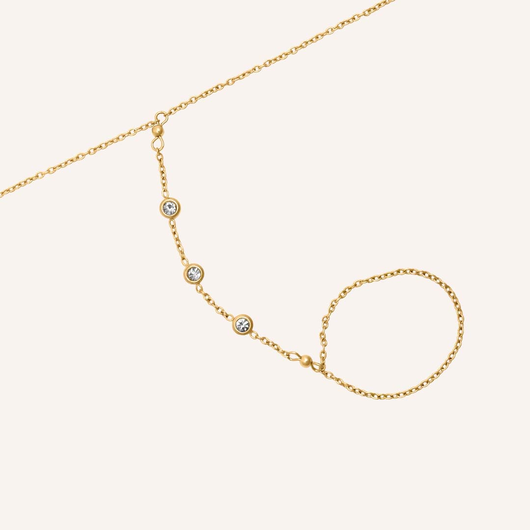 A clean hand chain with four bezel-set rhinestones across the hand. Minimal, shiny and ridiculously easy to style with everything.