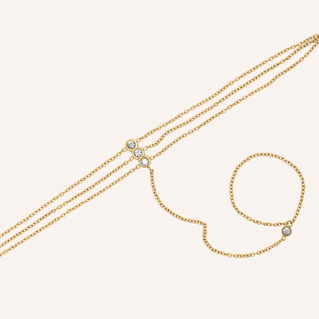 Elesse drapes twin rows of rhinestone bezels across the hand like a soft web of light. It feels like layered bracelets, but in one sleek statement.