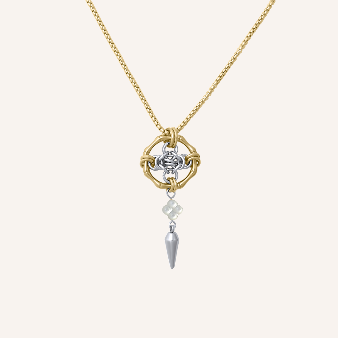 A layered chainmail necklace featuring a quatrefoil symbol and seashell clover, designed to add meaning to everyday wear.